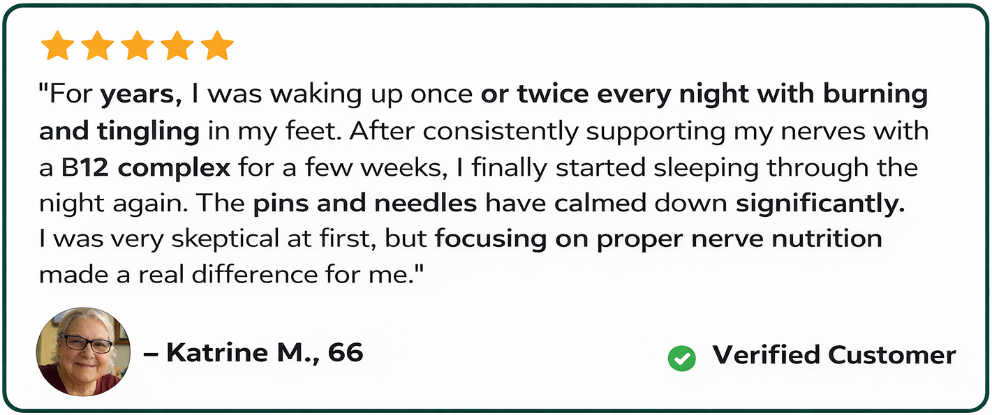 "I'll be honest, I almost didn't buy this. I'd already wasted money on three different B12 supplements and felt absolutely nothing. My sister kept pushing me to try it so eventually I caved. Within about 2 weeks I noticed I was actually sleeping through the night. The burning isn't completely gone but it's maybe 30% of what it was. I'm on my third bottle now and I genuinely don't want to find out what happens if I stop."