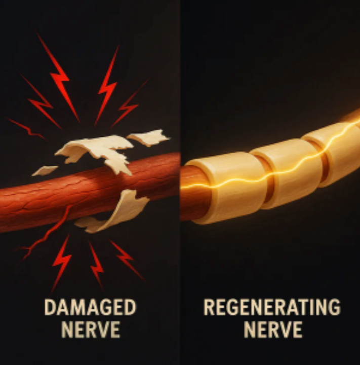 Fuels nerve cells with the energy they need to carry out repair. Without it, nerve tissue starves mid-rebuild.